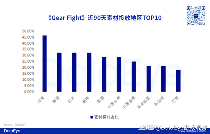 DataEye-ADX海外版数据显示,《Gear Fight》在近90天主投亚洲市场,其中印度、韩国、日本以及东南亚都是项目组侧重投放的地区。投放全地区TOP10中,亚洲地区占据9个席位,美国地区投放占比并不高。