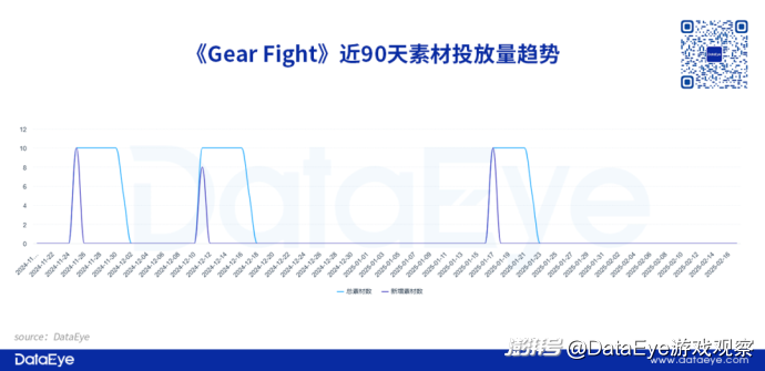 DataEye-ADX海外版数据显示,《Gear Fight》在去年11月24日就进行了测试素材投放,至今一共测试了三次,整体力度也不算大。而在第三次测试之后(1月23日)就基本停止了买量投放,这或许是游戏产品在测试阶段已经收集到足够的数据,为下一轮投放进行准备、调整。