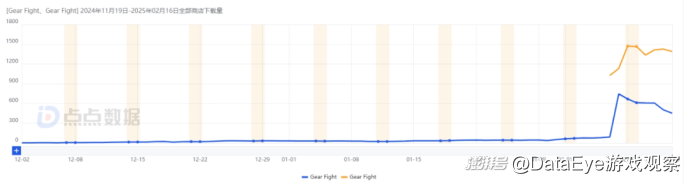 2024年12月《Gear Fight》在部分市场进行了前期测试,直到今年2月7日才正式上架美国市场。而此时产品所上架的市场并不多,除了美国市场之外,还有部分欧洲市场,以及中国香港地区。目前仍未上线日韩等主流市场。