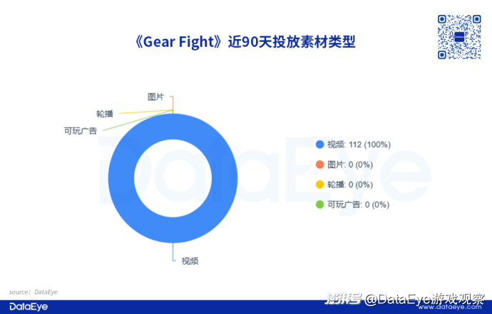 DataEye-ADX海外版数据显示,《Gear Fight》目前投放的所有测试素材类型均为视频素材,占比达100%。