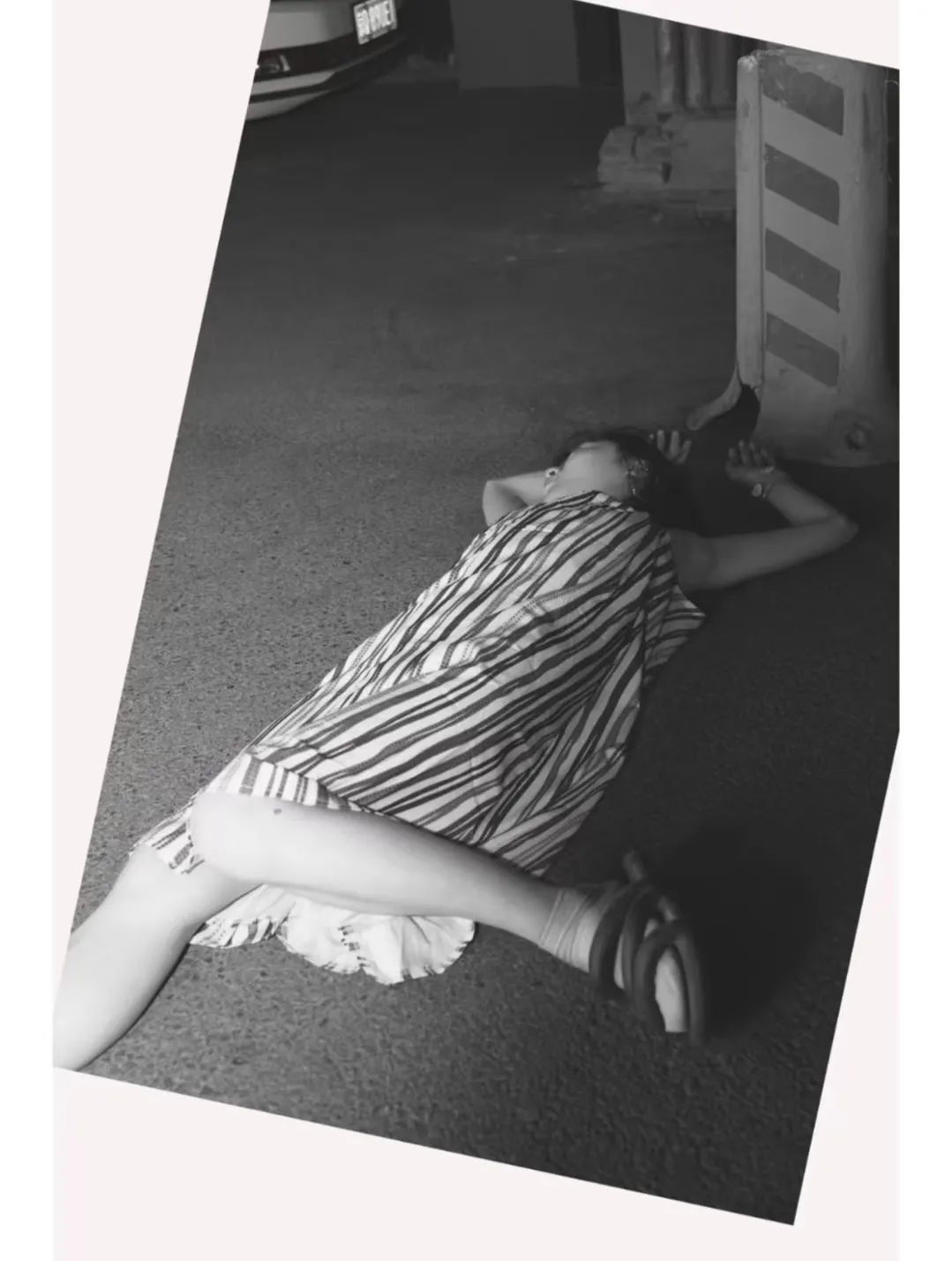 张自忠路,一辆车停在路边。“你可以躺在马路上吗?”摄影师郑三喜问星可。星可点点头,按照郑三喜的意思躺了下来,她身穿的彩色条纹连衣裙与粗糙的地面紧紧贴合。