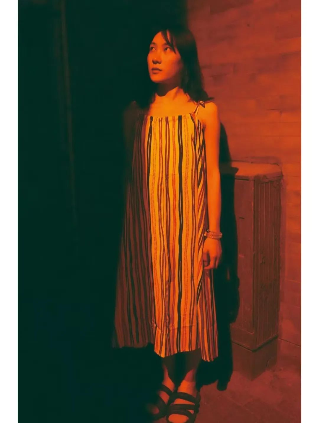 即使是路边不起眼的电表箱,也能成为她拍摄的背景板。在郑三喜的指挥下,星可站在电表前,仰起脸向上看,路灯的光在她的身体上形成一道分割线,一半橙黄,一半浸入黑暗,“一边是热烈的,一边是暗淡的。”郑三喜描述道。