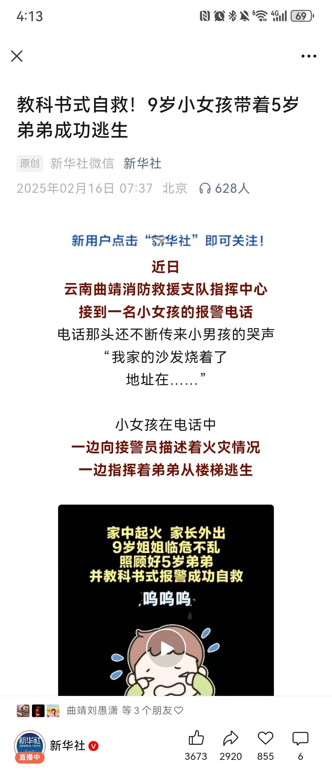 近日,曲靖市一名9岁女孩在家庭火灾中带领弟弟教科书式自救逃生的事迹引发全国关注,成为全民热议的安全教育与应急救援的典范案例。事后消防部门还为女孩颁发了“消防安全小英雄”奖状。该事件被人民日报、新华社、央视网、光明网、云南日报、云南广播电视台等60余家中央、省级主流媒体宣传报道,“学习强国”“中华人民共和国应急管理部”“中国消防”“云南省教育厅”等40余个官方政务平台集中转发推广,相关话题登上抖音、快手、微博同城热搜榜第一,阅读量达上亿次。