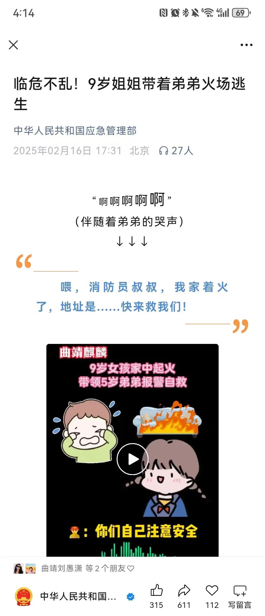 此次事件中,年幼姐弟的冷静应对与消防员的专业救援形成“生命接力”,展现了安全教育的社会价值。媒体聚焦不仅传递了正能量,更为公众敲响了居家消防安全的警钟。原标题:《央媒看云消 | 人民日报、新华社等集中报道曲靖9岁女孩教科书式自救事迹》