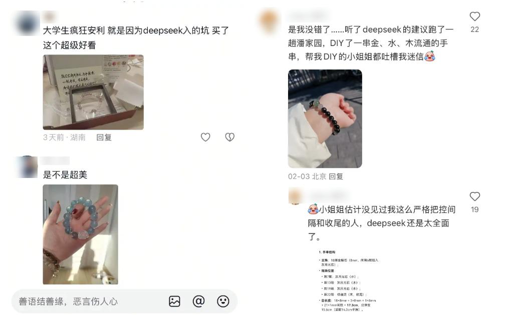 抖音“DeepSeek玄学指令教程”的评论区,长满了因为DeepSeek推荐而选购水晶的年轻人,小红书上有热帖直言新年的第一波钱,是因为DeepSeek花的——用来买水晶了。