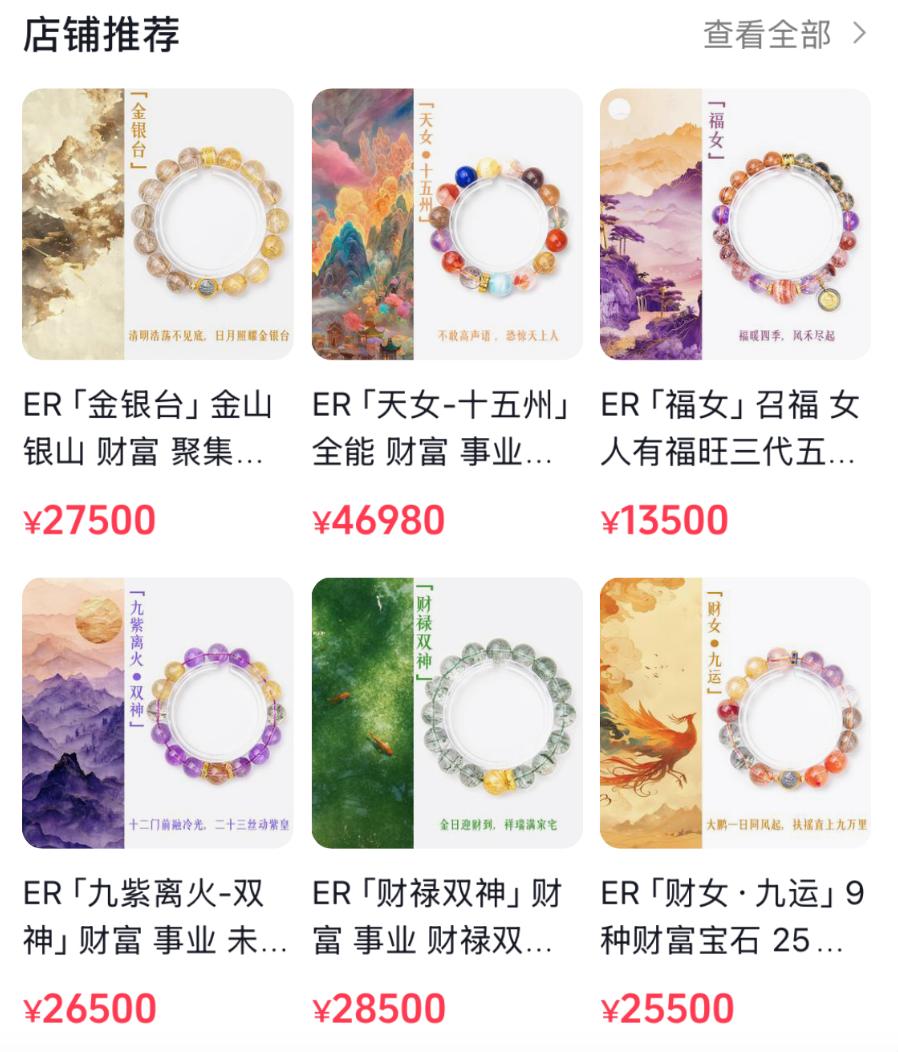 在 @左岩 的抖音小店中,水晶手串被命名为各种带有美好寓意的名称,定价均在千元以上甚至过万。