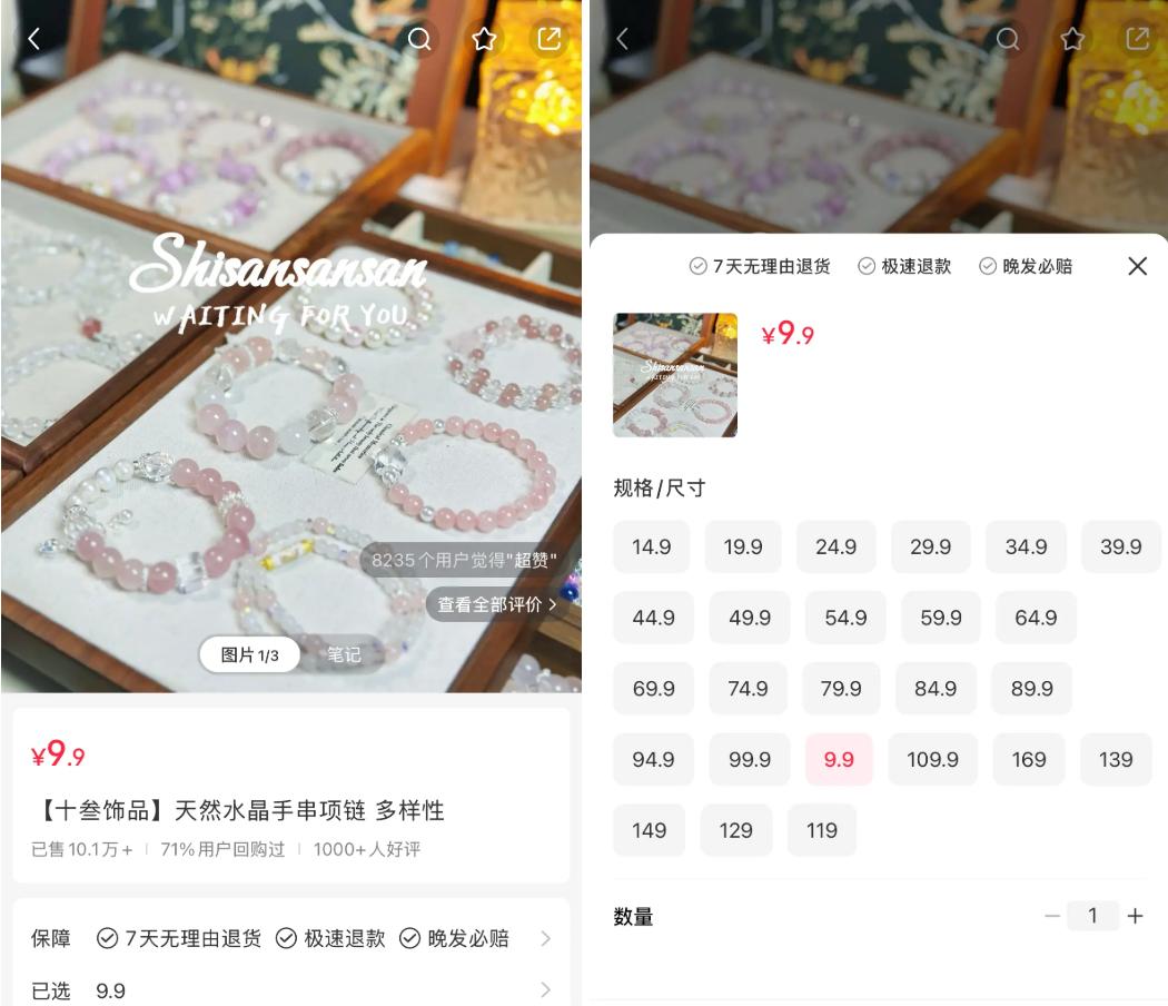 小红书上的水晶销售方法也大同小异,销量最高的水晶手串商品链接截至2月19日已售10.1万+,价格从9.9-119元不等,关联的笔记文案称其为“富婆水晶”。