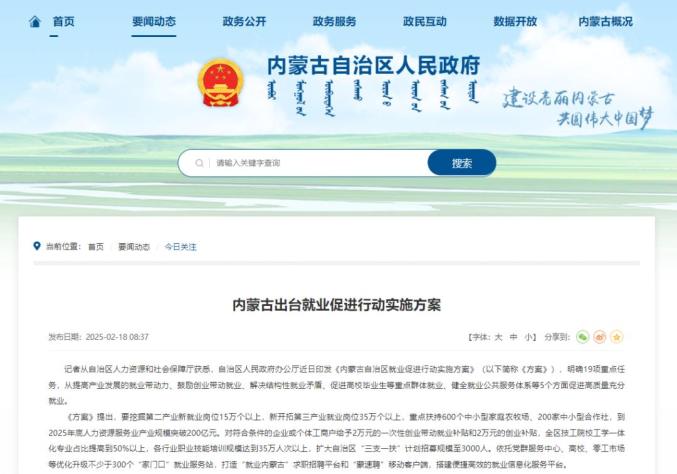 2月18日,内蒙古自治区人民政府官方网站发布了《内蒙古出台就业促进行动实施方案》。该方案亮点颇多,明确19项重点任务,从提高产业发展的就业带动力、鼓励创业带动就业、解决结构性就业矛盾、促进高校毕业生等重点群体就业、健全就业公共服务体系等5个方面促进高质量充分就业。其中一项关键举措为:将扩大内蒙古自治区 “三支一扶” 计划的招募规模,今年计划招募人数高达 3000 人 。