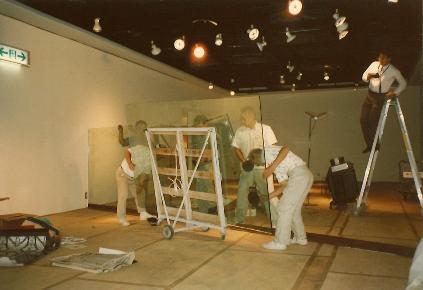 谷文达室内作品安装现场,1991 年,福冈,日本谷文达的室内作品是由三块大玻璃组成的玻璃墙,底部用钢结构固定。三块严格按照黄金分割率裁剪的玻璃把展厅一切为二,透明的玻璃暴力地阻断了展览的动线,使空间的张力达到了极限。倾斜的玻璃板切割线又给与空间以活力。原本可以畅通无阻的展厅,由于玻璃墙的隔断,参观者只能分别从展厅前后的两扇门门单独进出。