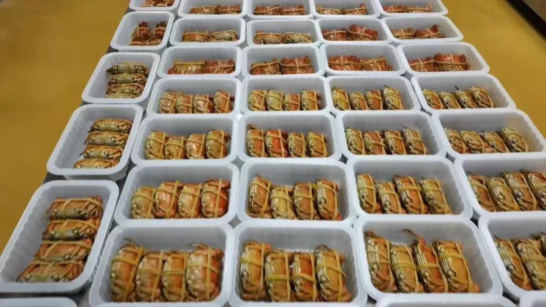蒸煮、冷却、泡卤、装盒……在安丰镇的蟹小七水产品有限公司生产车间,工人们正在生产花雕蟹。花雕蟹通过线上接单,顺丰快递配送给客户。
