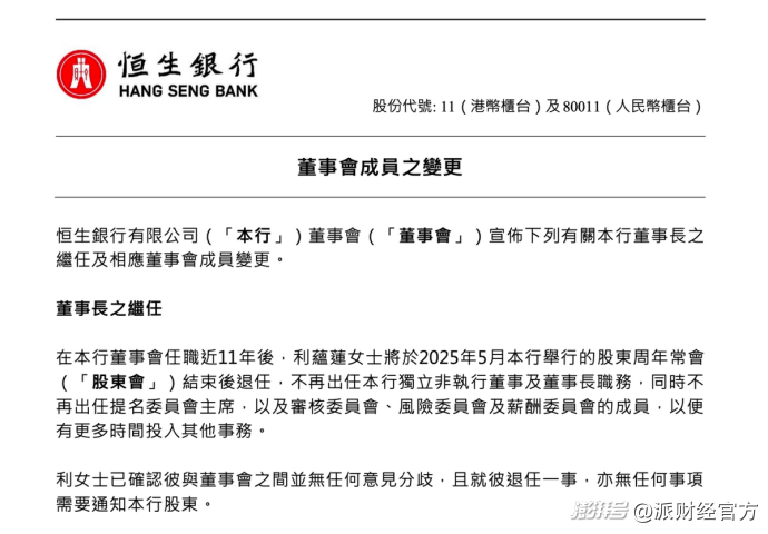 公告显示,在恒生银行董事会任职近11年后,利蕴莲将于2025年5月举行的股东周年常会(股东会)结束后退任,不再出任独立非执行董事及董事长职务,同时不再出任提名委员会主席,以及审核委员会、风险委员会及薪酬委员会的成员,以便有更多的时间投入其他事务。