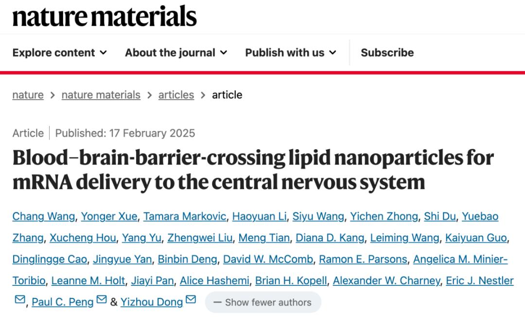 2025 年 2 月 17 日,西奈山伊坎医学院董一洲教授团队在 Nature 子刊 Nature Materials 上发表了题为:Blood–brain-barrier-crossing lipid nanoparticles for mRNA delivery to the central nervous system 的研究论文。