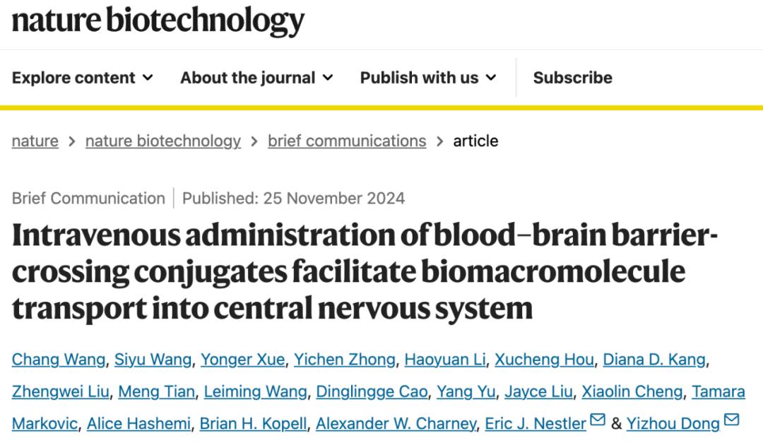 2024 年 11 月 25 日,董一洲教授团队在 Nature Biotechnology 期刊发表了题为:Intravenous administration of blood–brain barrier-crossing conjugates facilitate biomacromolecule transport into central nervous system 的研究论文。该研究开发了一种γ-分泌酶介导跨血脑屏障偶联(BCC)系统,能够跨越血脑屏障,通过静脉注射将生物大分子(例如寡核苷酸)安全有效递送到中枢神经系统(CNS),对小鼠模型、人类脑组织进行基因沉默。