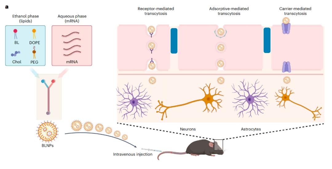 该研究开发了一种新型脂质纳米颗粒(LNP)系统——MK16 BLNP,能够突破血脑屏障,通过静脉注射将 mRNA 递送至大脑中枢神经系统中的神经元和星形胶质细胞,为未来治疗阿尔茨海默病、渐冻症、脑肿瘤以及药物成瘾等一系列脑部疾病铺平了道路。