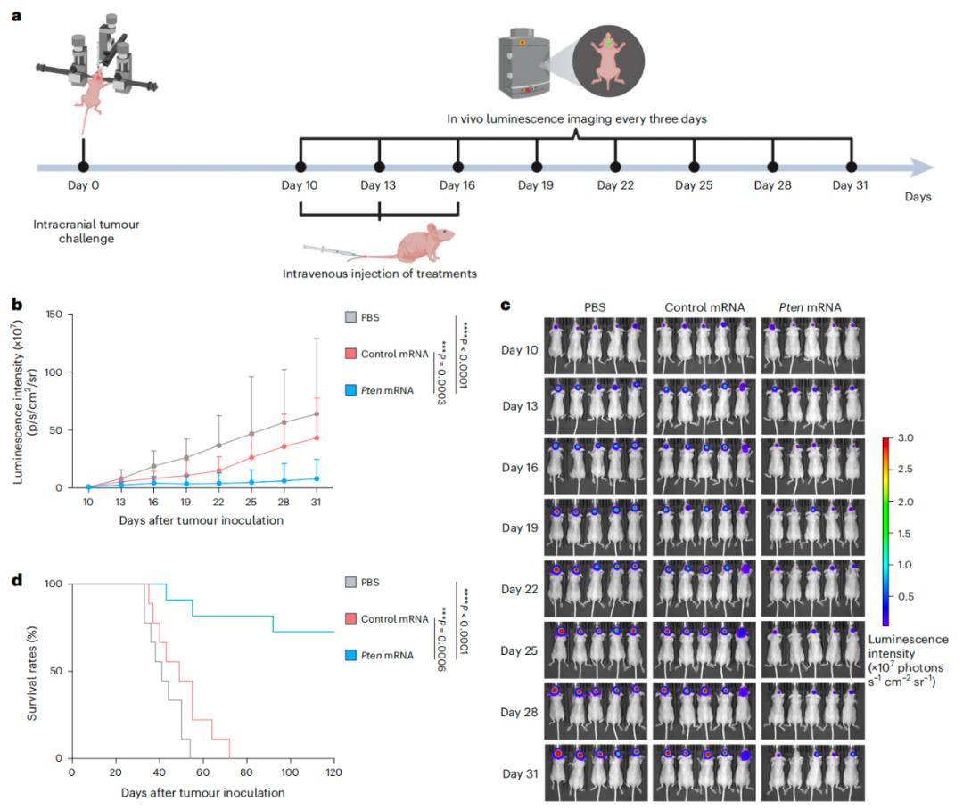 MK16 BLNP递送Pten mRNA,显著原位胶质母细胞瘤小鼠模型生存率总的来说,该研究设计并合成了一系列能够跨越血脑屏障的脂质纳米颗粒(BLNP),能够高效地将 mRNA 递送到大脑中的神经元和星形胶质细胞。尤其是 MK16 BLNP,通过小窝蛋白和γ-分泌酶介导的跨细胞作用跨越血脑屏障,表现出良好的耐受性和广泛的应用前景。这项研究为向中枢神经系统递送 mRNA 提供了一个有前景的平台,有望为治疗多种脑部疾病开辟新途径。