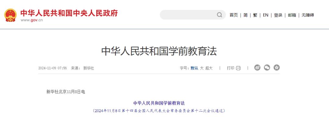 《中华人民共和国学前教育法》于2024年11月8日第十四届全国人民代表大会常务委员会第十二次会议通过,自2025年6月1日起施行。