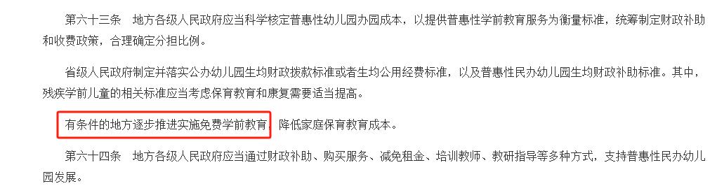 第六十三条提到,有条件的地方逐步推进实施免费学前教育,降低家庭保育教育成本。