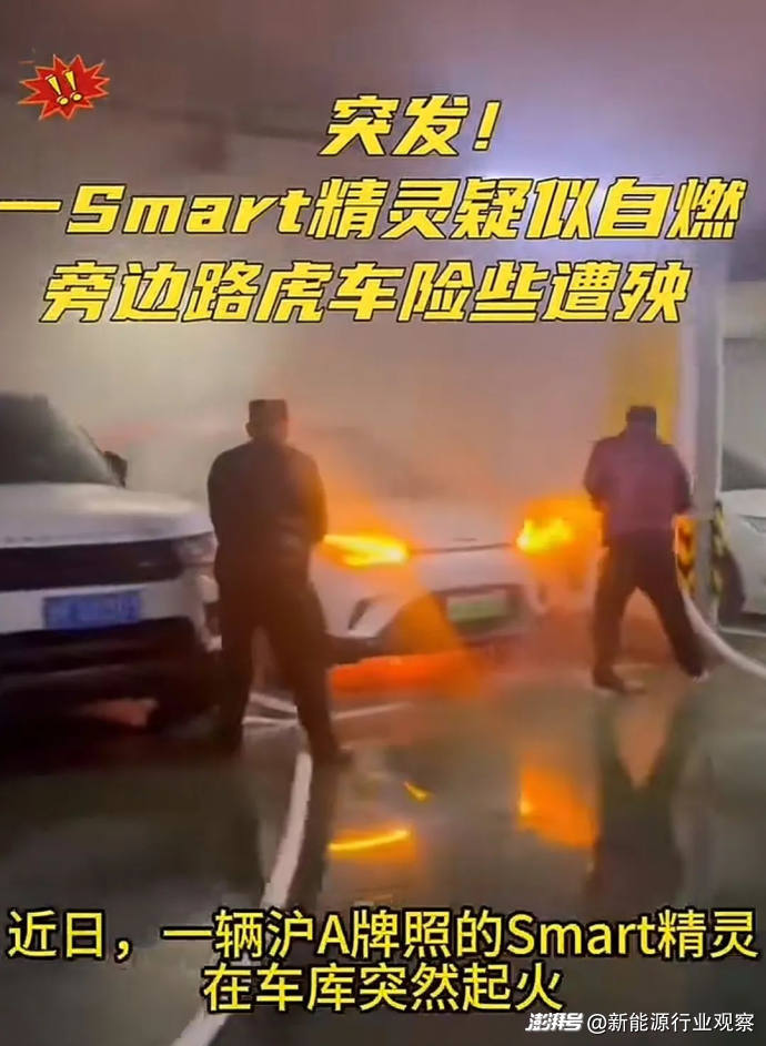 2月19日,有博主分享了一辆上海牌照的Smart 精灵在地库起火,尽管有人试图用消防水管灭火,但火势并未及时控制,旁边的路虎惨遭烘烤。