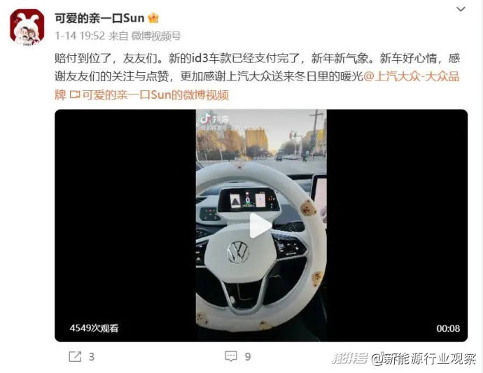 无奈之下,孙女士将该事件公布在其社交平台上,并迅速上了热搜。2025年1月14日,她更新了微博,“赔付到位,车款已经支付完了”。