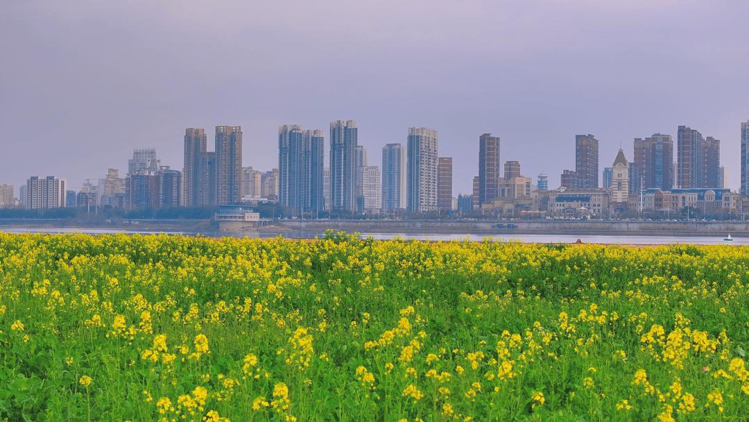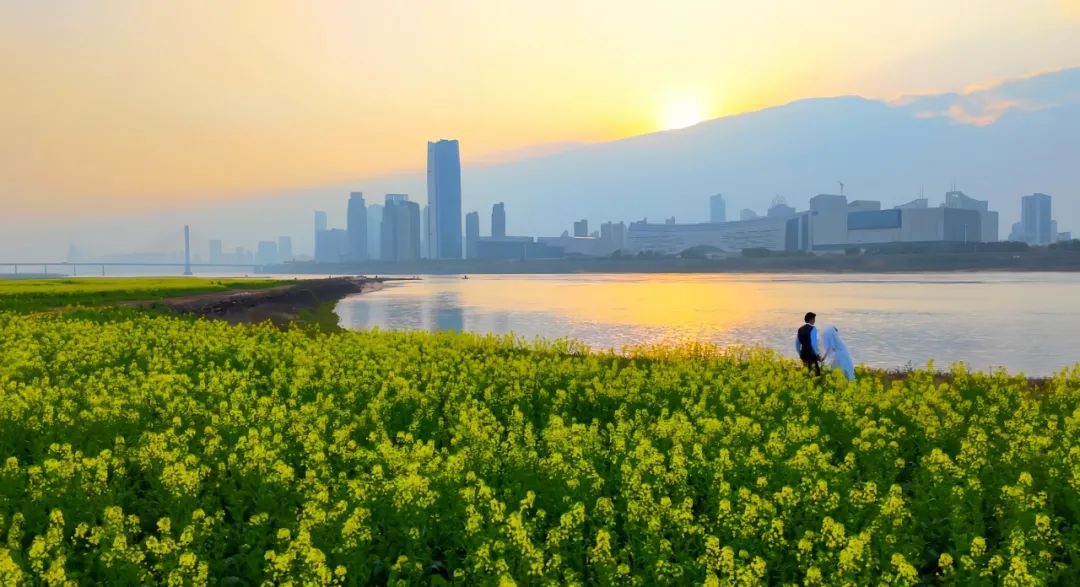 金色的油菜花与万米赣江沙滩相互映衬,让人切身体会到