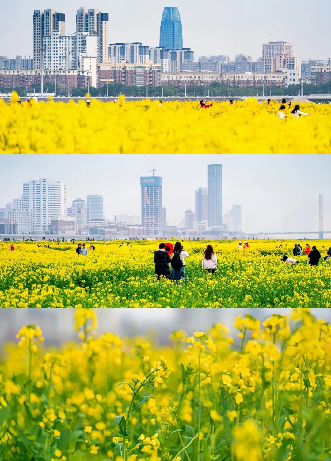 迎着和煦的春风游人穿梭在田间赏花拍照