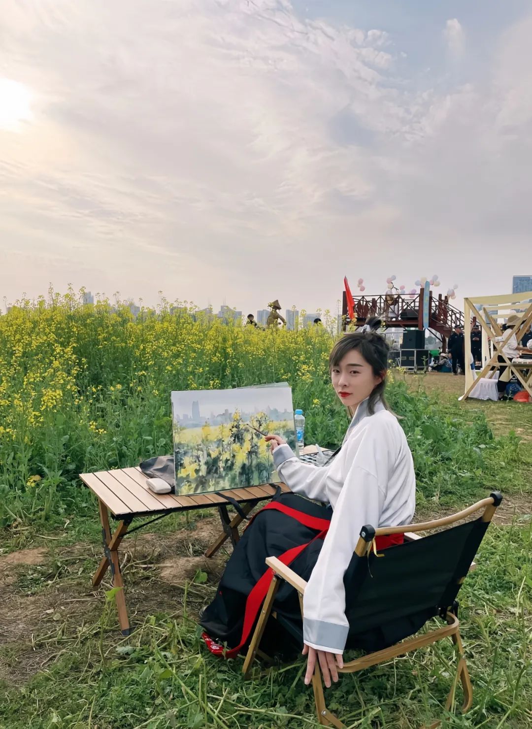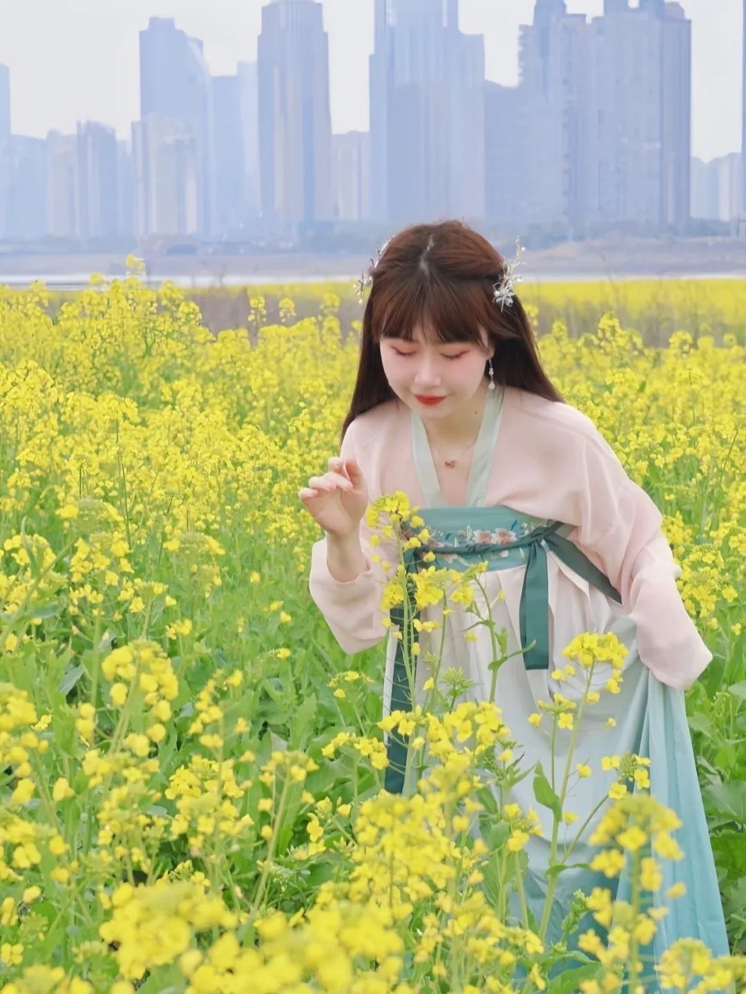 油菜花拍照攻略衣服:颜色以米色、浅蓝、淡粉等低饱和度色系为主,款式可以选择连衣裙、白衬衫、针织衫