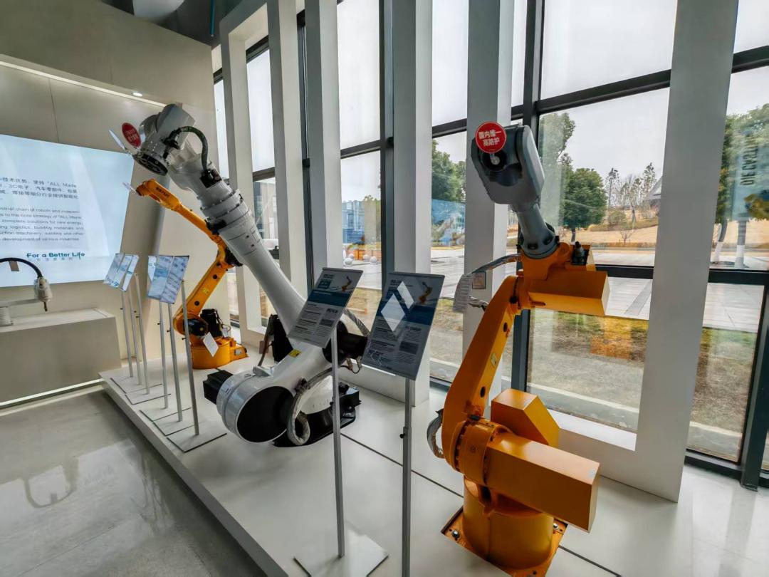 “它是全球唯一光伏行业专用高速机器人、这是全球独创智能折弯专用机器人、这台是国内唯一高防护压铸机器人……”