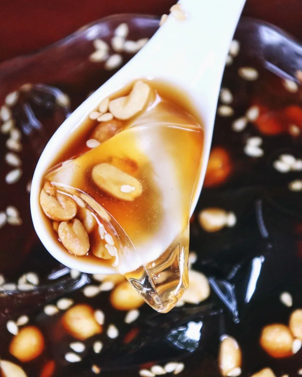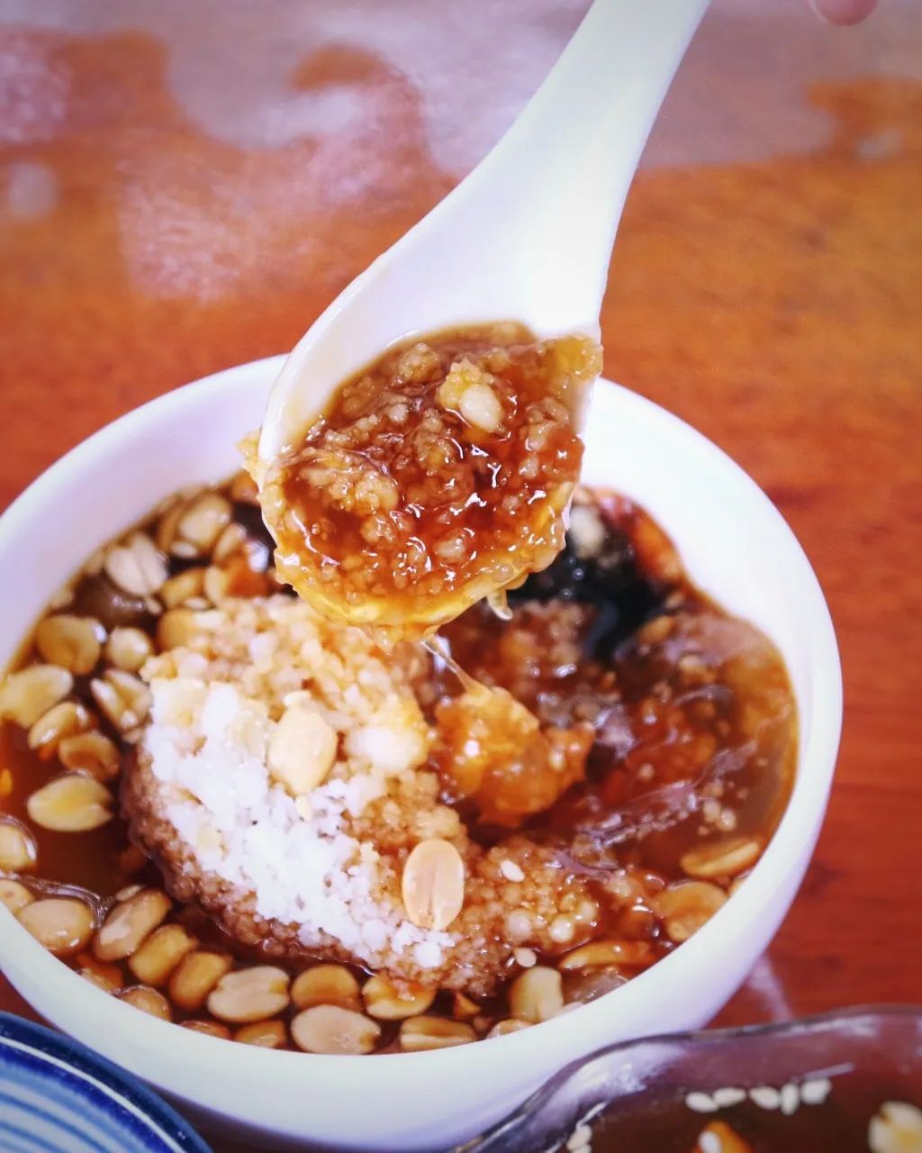 糕粑稀饭制作精细,以藕粉打底,大米与糯米混合蒸熟的糕粑软糯可口。再加上瓜子、芝麻、花生仁、蜜饯等丰富配料,最后淋上古镇特制的玫瑰酱,香气四溢。糕粑稀饭一定要趁热拌开才好吃!