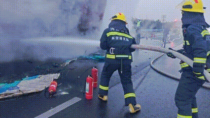 消防员到场后了解到一辆大巴车与同向行驶的厢式货车