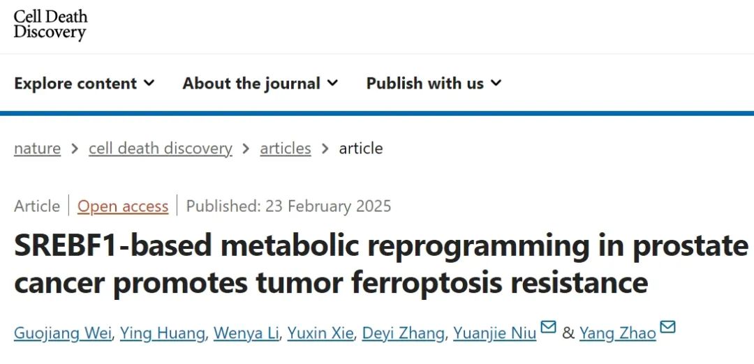 【导读】前列腺癌中的代谢重编程被广泛认为是肿瘤进展和耐药性的促进因素。这项研究调查了代谢重编程与前列腺癌中铁蛋白沉积抵抗的关系,并探索了其治疗潜力。2025年2月23日,天津医科大学第二医院的研究团队在期刊《Cell Death Discovery》上发表了题为“SREBF1-based metabolic reprogramming in prostate cancer promotes tumor ferroptosis resistance”的研究论文。