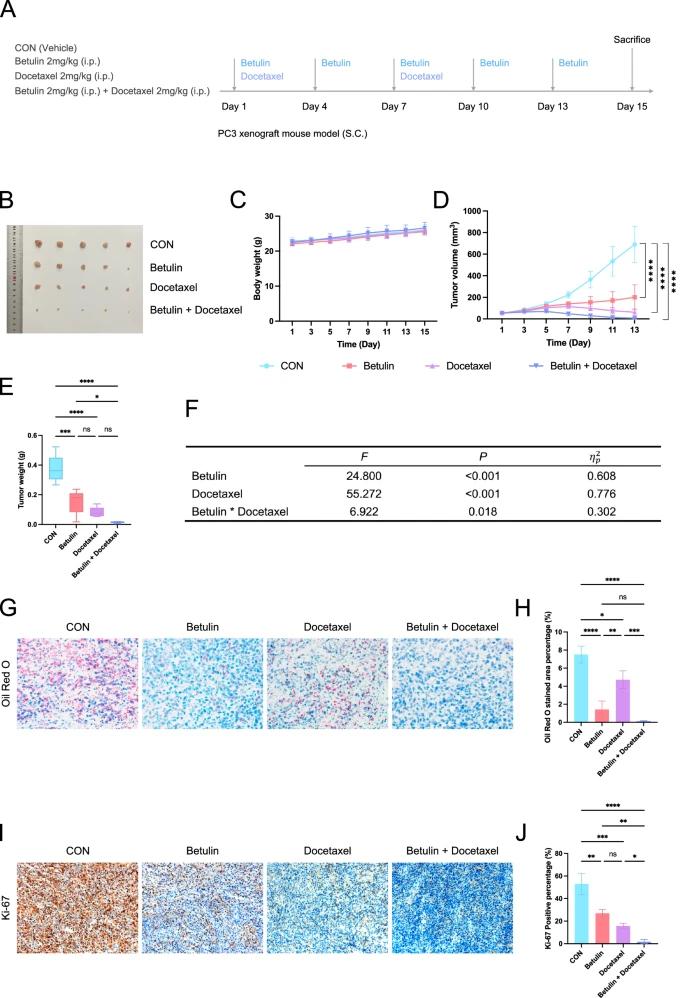 团队构建了PC3前列腺癌皮下异种移植肿瘤模型,并使用白桦脂、单独使用多西他赛或白桦脂与多西他赛联合使用来观察它们的治疗效果。Betulin和多西他赛单独使用时可中度抑制肿瘤生长,而联合使用时抑制肿瘤生长的效果更明显。无论是单独使用还是联合使用,对小鼠体重都没有明显影响。白桦脂治疗和多西他赛治疗具有显著的主效应。白桦脂素和多西他赛处理的交互效应显著。Betulin处理可显著降低组织脂滴的水平;单独使用Betulin和多西他赛可抑制肿瘤增殖,而Betulin和多西他赛联合使用可产生更强的抑制作用。