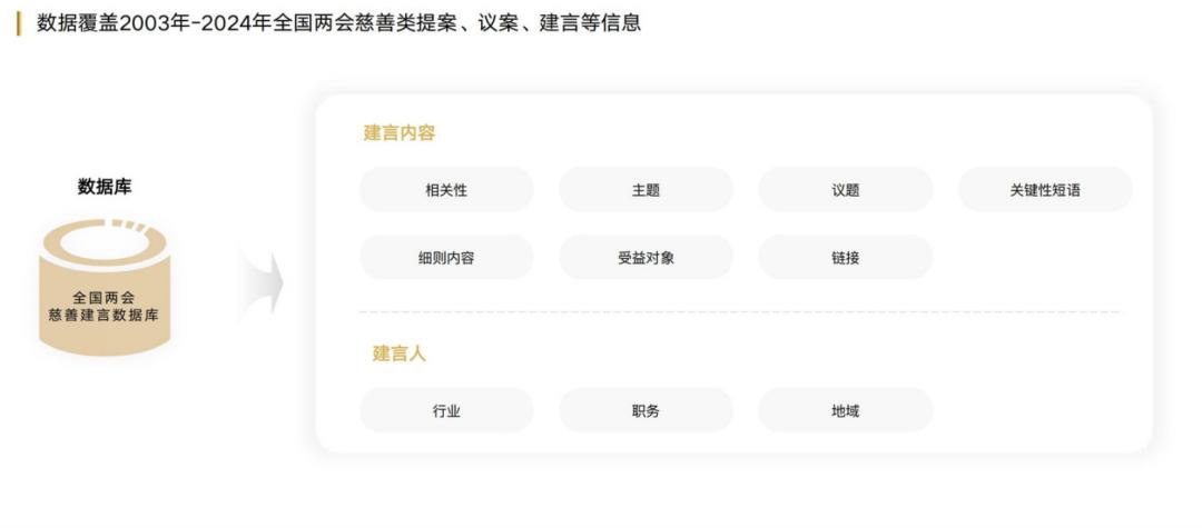 构建全国两会慈善类建言数据库《报告》团队创新性地引入了大模型技术,构建了覆盖22年全国“两会”慈善类建言的核心数据库。