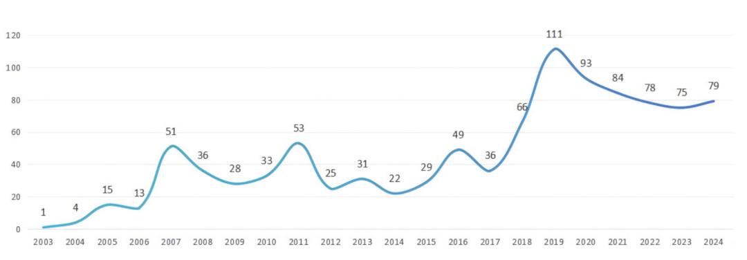 5大观察“解码”22年慈善类建言脉络观察1:2003-2024年间的慈善类建言数量呈现整体上升趋势,曾出现4次周期性高峰