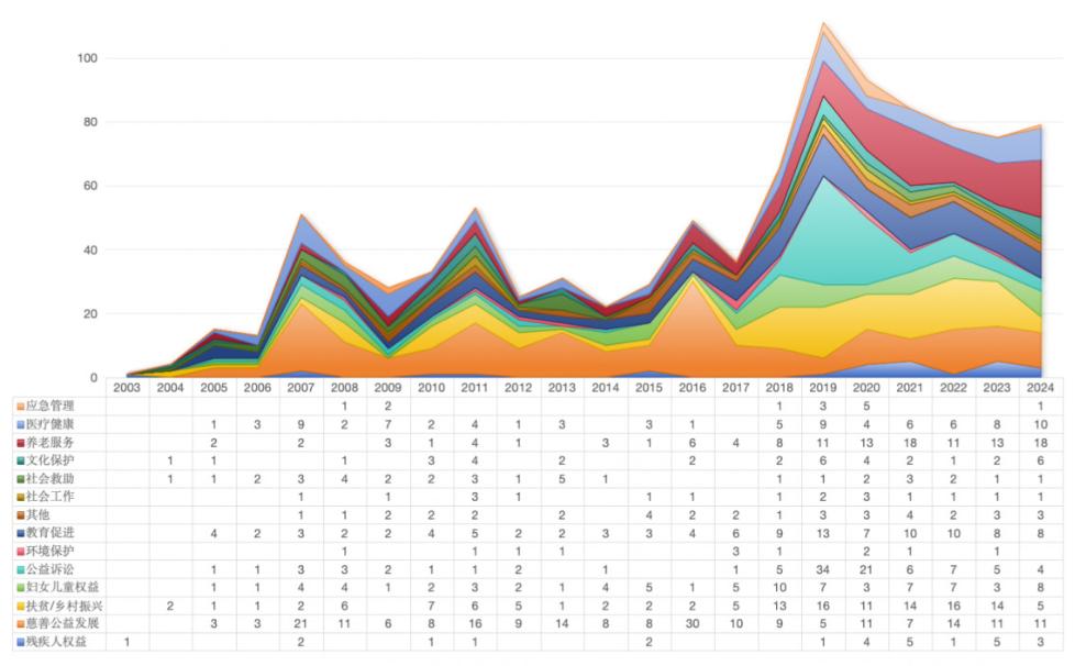 观察3:慈善公益事业已广泛嵌入社会生活,扶贫/乡村振兴、养老服务、教育促进等主题近10年增长明显