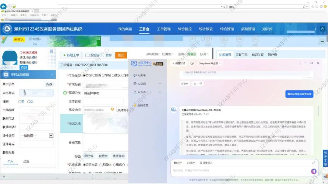 中国电信潮州分公司与政数局联手开展12345政务服务热线平台接入Deepseek的创新探索,推进DeepSeek在热线的应用,在12345开通47台坐席云电脑,并在坐席云电脑上加载Deepseek AI应用中心,提供从7B、32B、70B及671B满血版各种版本供话务员使用,全面提升平台服务能力。同时与政数局推进DeepSeek的本地化部署及应用场景测试,基于DeepSeek探索政务服务大厅、公共资源交易中心、12345智能客服等应用场景对接,并就新一轮项目构建智能应用达成合作共识。