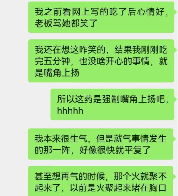 心情平和,加班也更有劲了:“晚上11点对着一堆文档加班都如沐春风,脸上不自觉洋溢着微笑。”职场之外,逍遥丸还被广泛运用于失恋、家庭争吵,以及孩子不肯写作业等多种场景。上一秒愤怒到怀疑自己的婚姻选择,吃完药的下一秒只觉得“世上没有什么事情值得生气”,比离婚冷静期更管用。