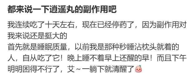 也有很多人反映自己吃完后副作用明显:本来是为了调理失眠,吃了一个星期有人发现自己嗜睡,睡不醒;也有人症状相反,沾上枕头就清醒。有人发现自己吃完逍遥丸后食欲大增,饿得特别快,一周胖了5斤。