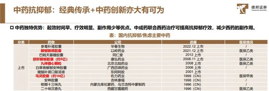 情绪保健药物的名单还在加长,中药这两年异军突起,在研和上市药物多达20种,名字也都很直接,“解郁”、“镇心”、“除烦”。以岭药业研发的“舒肝解郁胶囊”在2021年年末上市后被列入了医保目录,瞄准“大众可吃”的心理健康市场,副作用更小的中成药比西药更加大有可为。