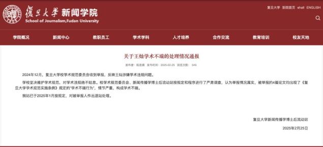 2月25日,复旦大学新闻传播学博士后流动站发布“关于王灿学术不端的处理情况通报”。