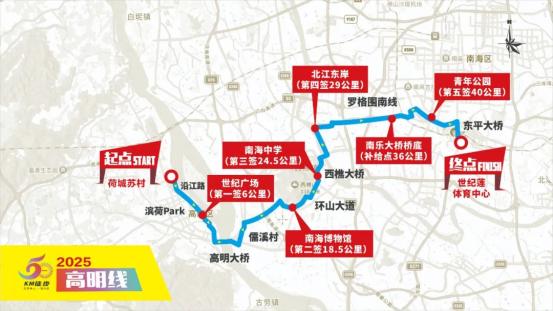荷城苏村(起点)→苏村大道→秀丽路→沿江路→滨荷Park生态文创园→荷城公园→世纪广场(第一签6公里)→灵龟公园→高明大桥(旧桥)→龙高路(加油站)→新田村健身步道→樵高路(海舟三乡路口)→儒溪村→环山大道→南海博物馆(第二签20公里)→环山花海→环山绿道→山根新村→南海中学(第三签25.5公里)→西樵大桥→北江东岸(第四签30公里)→沿江路→南庄一桥→南乐大桥桥底(补给点37公里)→罗格围南线→周尾围生态公园→凤翔大桥→江滨路→青年公园(第五签41公里)→江滨路→东平路→东平大桥→滨河景观公园→世纪莲体育中心(终点),全程约46.5公里。点击图片查看高明线详细介绍↓
