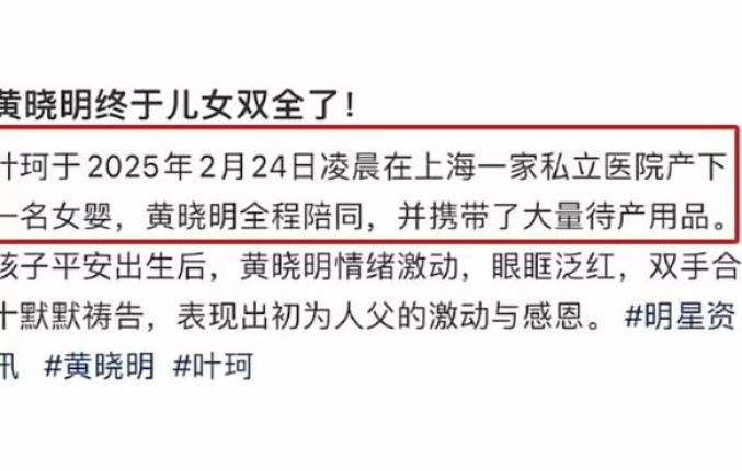 网传黄晓明女友叶珂于2月24日凌晨,在上海一家私立医院产下一名女婴,黄晓明正式成为两个孩子的父亲。他与前妻Angelababy(杨颖)育有一子“小海绵”,如今再添千金,被网友称为“儿女双全”的人生赢家。