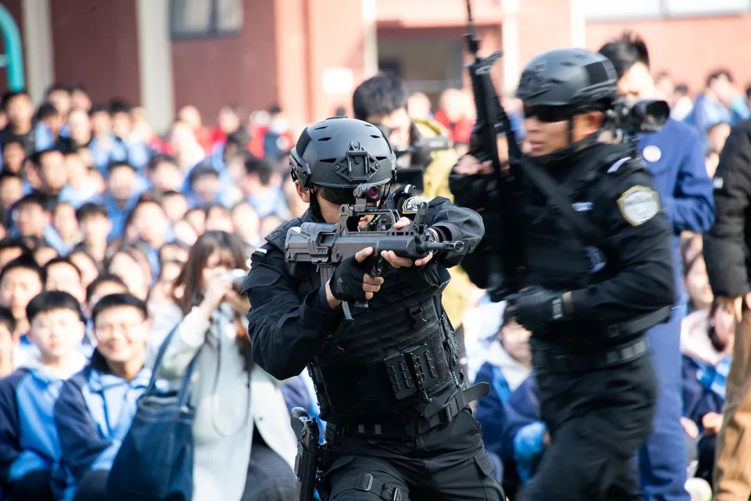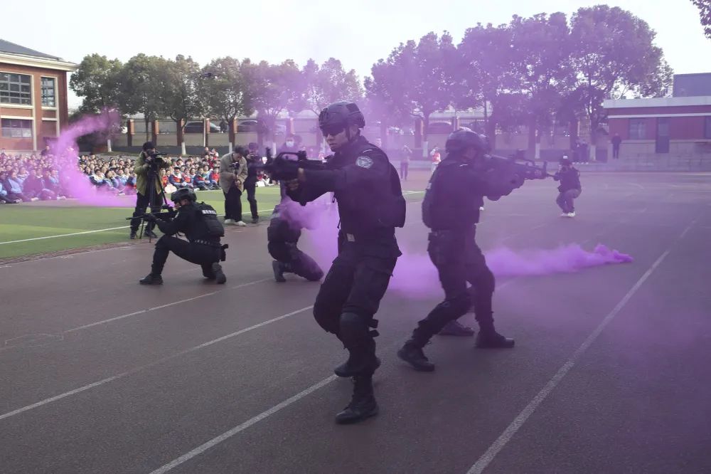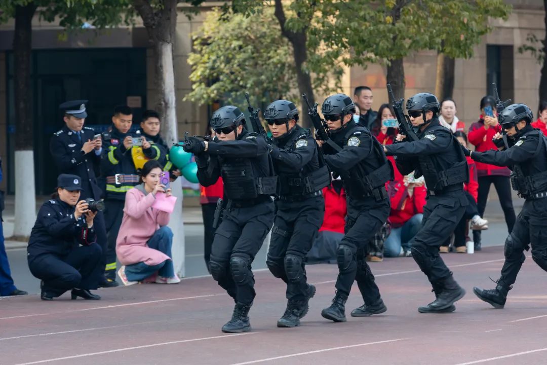 “发现目标——呈斜三角队形——进攻!”特警队员们精湛的战术演练将活动推向高潮,现场掌声雷动。