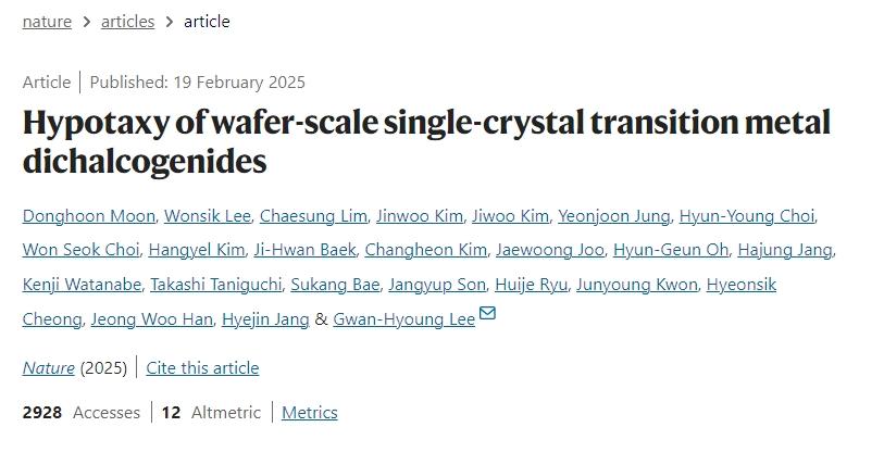 过渡金属二硫化物(TMDs)通过化学气相沉积(CVD)在晶体基底上外延生长。然而,这一方法需要将生长后的材料转移到目标基底上,导致厚度控制和可扩展性较难实现。首尔大学Gwan-Hyoung Lee团队提出了一种名为“hypotaxy”(“hypo”意为向下,“taxy”意为排列)的创新方法,旨在解决传统外延生长二维过渡金属硫族化合物(TMDs)在衬底选择、厚度控制及晶圆级单晶合成上的局限性。相较于现有技术(如蓝宝石上外延或金衬底模板法),hypotaxy通过非外延衬底上的模板导向生长,解决了传统方法对单晶衬底的依赖及转移工艺的复杂性,同时结合了低温、高均匀性和可扩展性优势,为TMDs在集成电路和异质结器件中的实际应用提供了新路径。该项研究成果以“Hypotaxy of wafer-scale single-crystal transition metal dichalcogenides”为题发表于Nature。