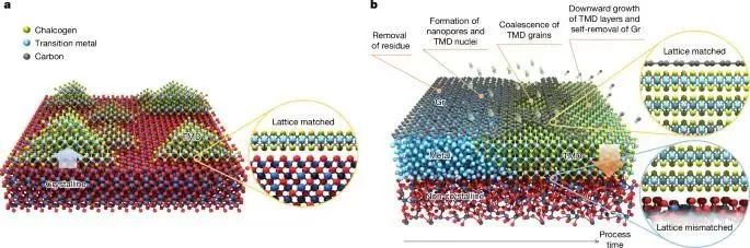 在石墨烯下方预沉积金属薄膜并通过硫化/硒化处理,形成取向一致的TMD晶核。石墨烯的移除后,晶核合并为单晶薄膜。这一过程利用石墨烯的范德瓦尔斯相互作用和晶格导向作用,实现了跨衬底的晶体一致性,克服了传统外延对衬底晶格匹配的依赖。