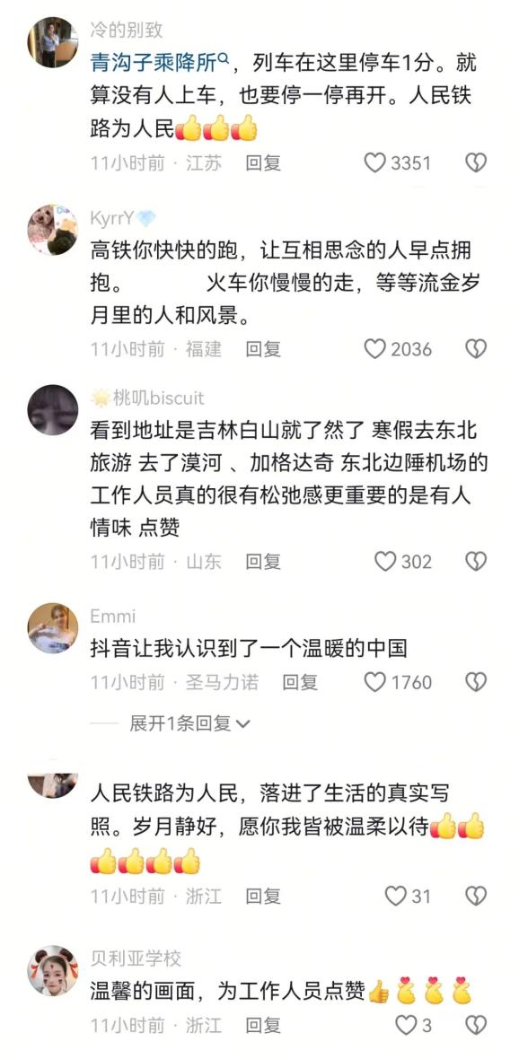 来自各地的网友们纷纷留言:“火车你慢慢地走,等等流金岁月里的人和风景。”“青沟子乘降所,就算没有乘客,列车也要停一分钟再开。”“看到地址是吉林省白山市,我就明白了,我去过东北旅游,那里最有人情味儿。”甚至有来自圣马力诺的网友说:“这里让我认识到一个温暖的中国。”……
