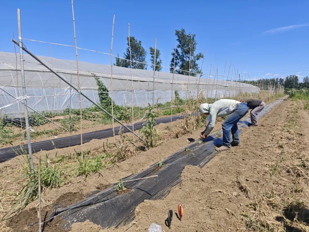 ●柳哥带着师傅给新苗拉线。去年6月,我们抵达小柳树农场时,柳哥正带着几位师傅给新苗拉线、以便后期固定,多番解释后师傅们才领会柳哥的布置。过后,柳哥直言不讳:现在的农民越来越不会种地了。