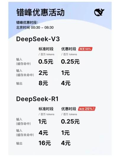 据了解,DeepSeek主要有两款主力模型DeepSeek-chat(基础大模型,对应V3)和DeepSeek-reasoner(推理模型,对应R1)。在标准时段(北京时间08:30—00:30),V3和R1的百万tokens输入(缓存命中)价格分别为0.5元和1元,百万tokens输出分别为8元和16元。而在优惠时段(北京时间00:30—08:30),V3和R1的百万tokens输入(缓存命中)则均降为0.25元,百万tokens输出均降为4元。