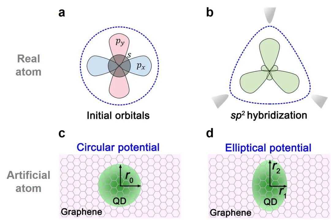 下半部分:人造原子中的(c)圆形势场和(d)椭圆形势场示意图。