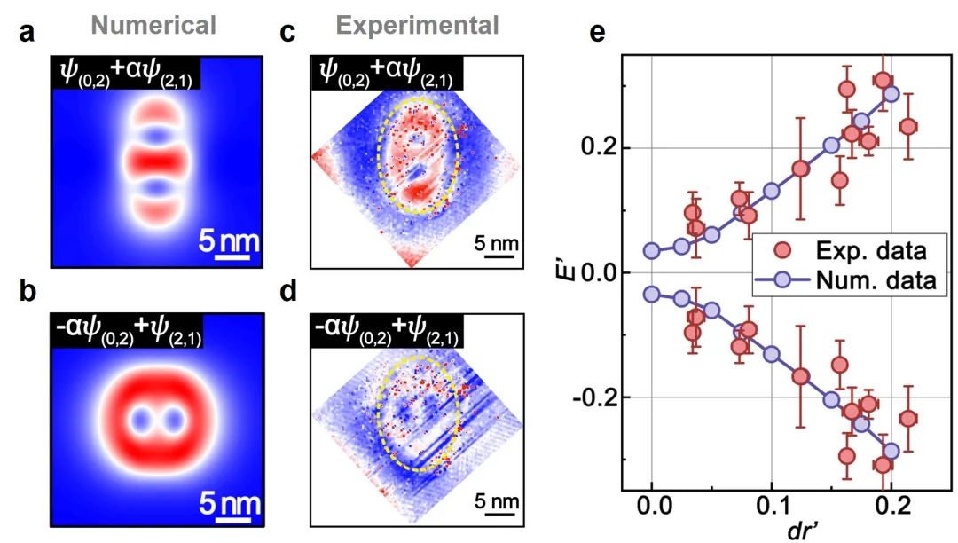 该研究指出,如果在石墨烯量子点中将圆形势场变形为椭圆形势场,轨道量子数为0的s轨道和轨道量子数为2的d轨道之间将会发生杂化,重新组合成两个新的杂化态。孙庆丰教授课题组从解析推导和数值计算两方面得到了杂化态的形状(图2a,b,θ形和倒θ形)。何林教授课题组在实验上利用扫描隧道显微镜(STM)针尖操纵技术,开发了制备具有不同各向异性程度量子点的方法,并对其中的受限态进行了系统探测,直接观测到了量子点受限态的轨道杂化特征(图2c,d)。