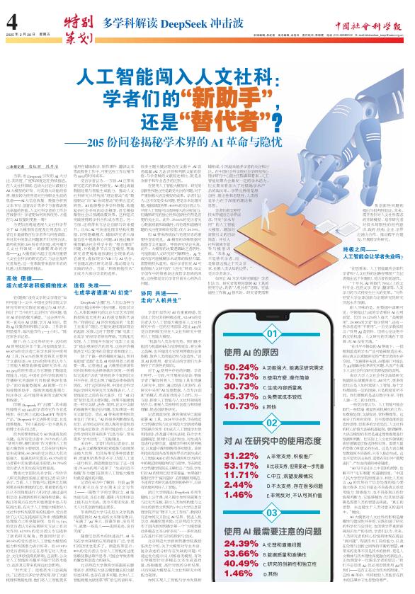 当前,由Deepseek引发的AI大讨论,其热度、广度和深度还在持续推进。在人文社科领域,这场大讨论从最初对AI大模型的好奇、对其强大功能的惊喜,继而转为使用者对自身职业生涯的焦虑——AI从信息收集、数据分析到文本书写、创意设计等多个方面都表现出卓越的性能,人文社科学者的工作会否被替代?学者要如何发挥优势,才能在与AI较量时更胜一筹?为更加直观地透视人文社科学界关于AI大模型的态度及应用选择,记者近日邀请数百位学者参与问卷调查,并对其中的焦点问题展开针对性访谈。最终收到的205份有效问卷,或可揭开人文社科领域一场静默革命的序幕——AI大模型的兴起正在深刻重塑人文社会科学的研究范式、方法论及研究者角色,这一变革既带来前所未有的机遇,也伴随新的挑战。